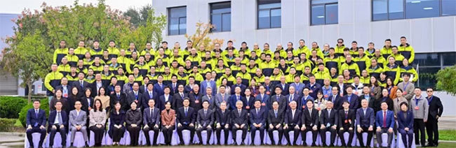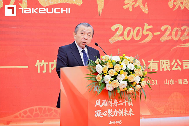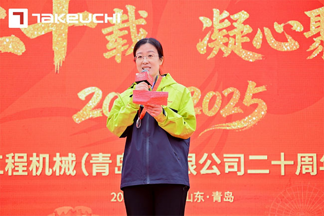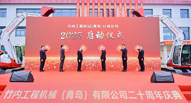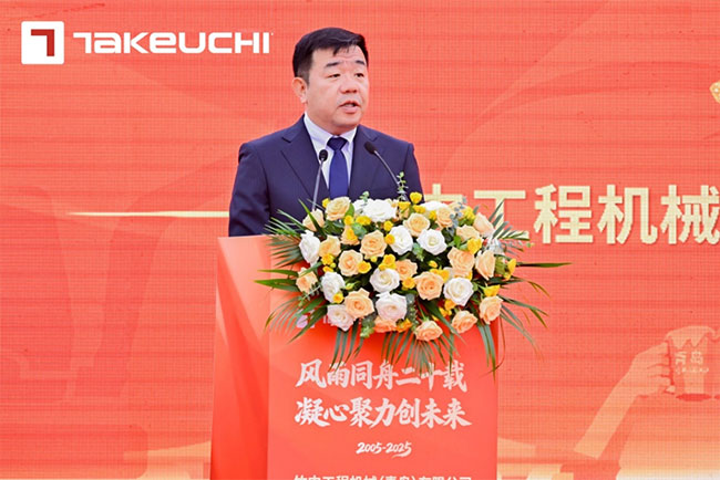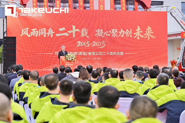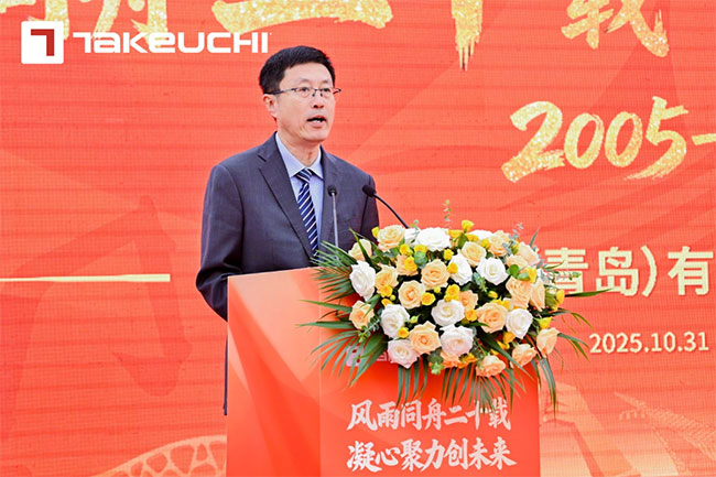 2025 年 10 月 31 日上午 9 时,公司成立 20 周年庆典在厂区隆重启幕。日本国驻青岛总领事馆斋藤宪二总领事,日本贸易振兴机构青岛代表处皆川幸夫所长,青岛经开区工委委员、管委常务副主任杨文先生及新区相关部门领导,合作伙伴代表,株式会社竹内制作所竹内敏也社长,刘峰总经理,与公司员工齐聚一堂,共庆这一里程碑时刻。